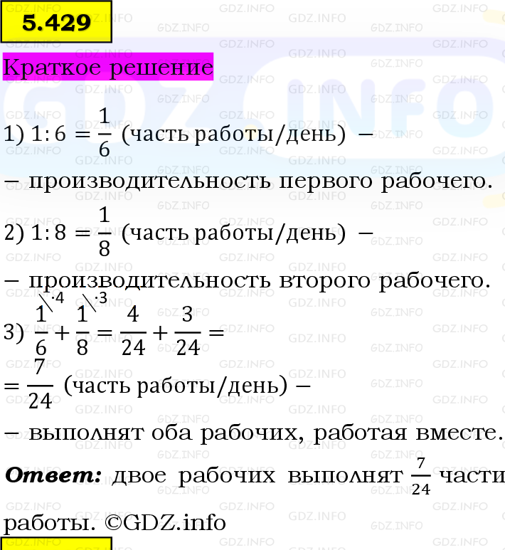 5.429. Один рабочий может выполнить всю работу за 6 дней, а другой — за 8 дней. Какую часть работы выполнят оба рабочих за 1 день, работая вместе?