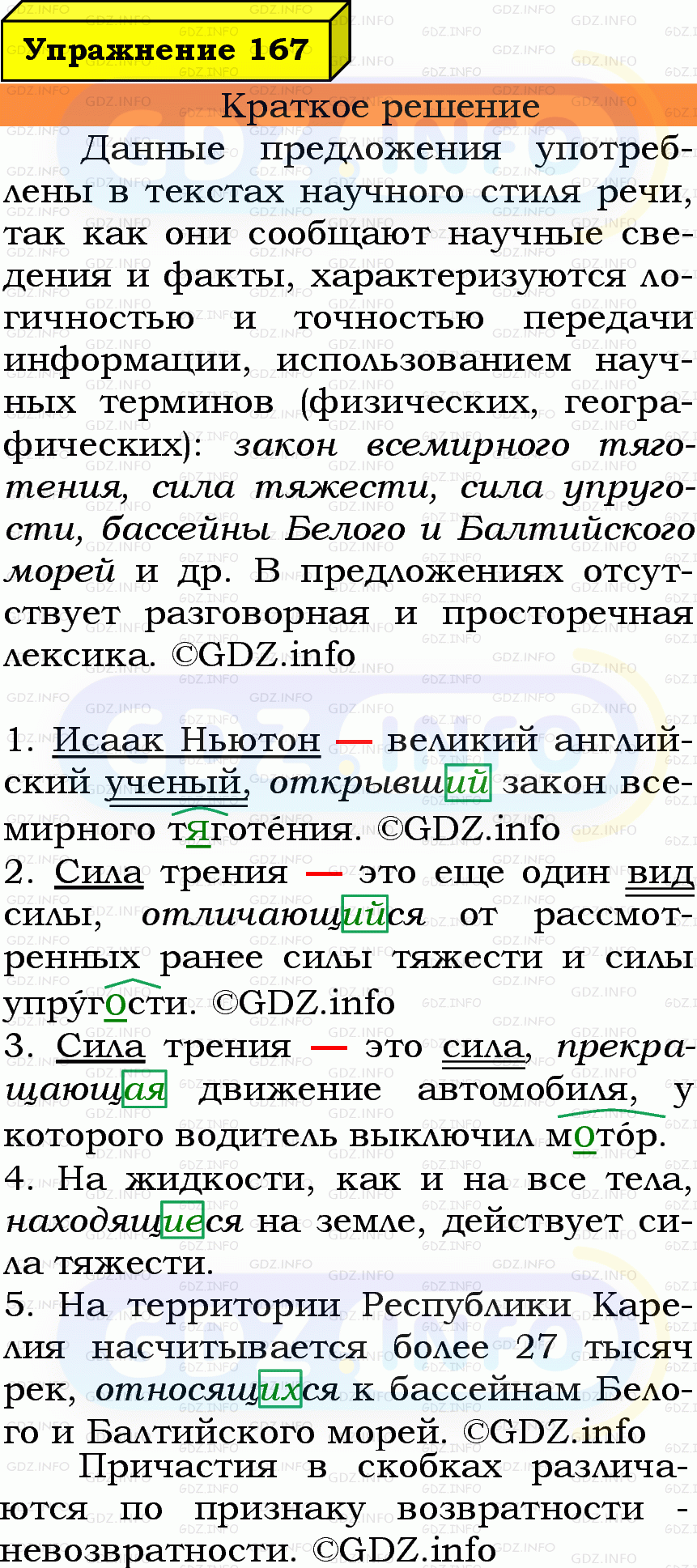 ГДЗ (готовое домашние задание из решебника) по Русскому языку 7 класса авторов М.Т. Баранов, Т.А. Ладыженская, Л.А. Тростенцова, 2013г. / 2019г. / 2023г. на Номер №167.Условие 2023 г.