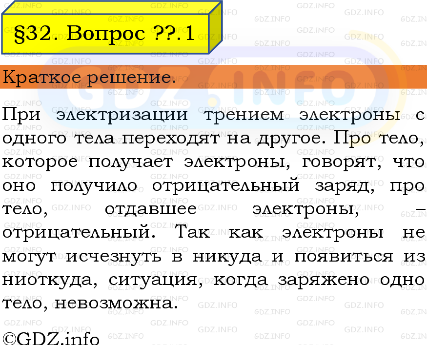 ГДЗ (готовое домашние задание из решебника) по Физике 8 класса авторов И. М. Перышкин, А. И. Иванов, Просвещение, 2023-2025г. ФГОС на Обсуди с товарищами №1, § 32. Закон сохранения электрического заряда.