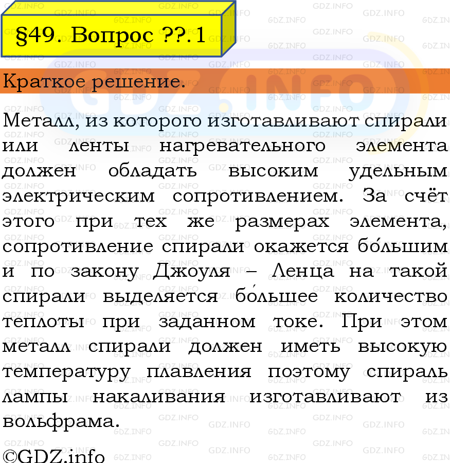 ГДЗ (готовое домашние задание из решебника) по Физике 8 класса авторов И. М. Перышкин, А. И. Иванов, Просвещение, 2023-2025г. ФГОС на Обсуди с товарищами №1, § 49. Короткое замыкание. Предохранители.