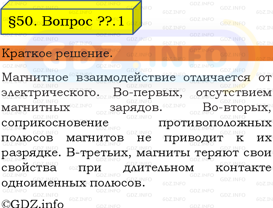 ГДЗ (готовое домашние задание из решебника) по Физике 8 класса авторов И. М. Перышкин, А. И. Иванов, Просвещение, 2023-2025г. ФГОС на Обсуди с товарищами №1, § 50. Постоянные магниты. Магнитное поле постоянных магнитов.