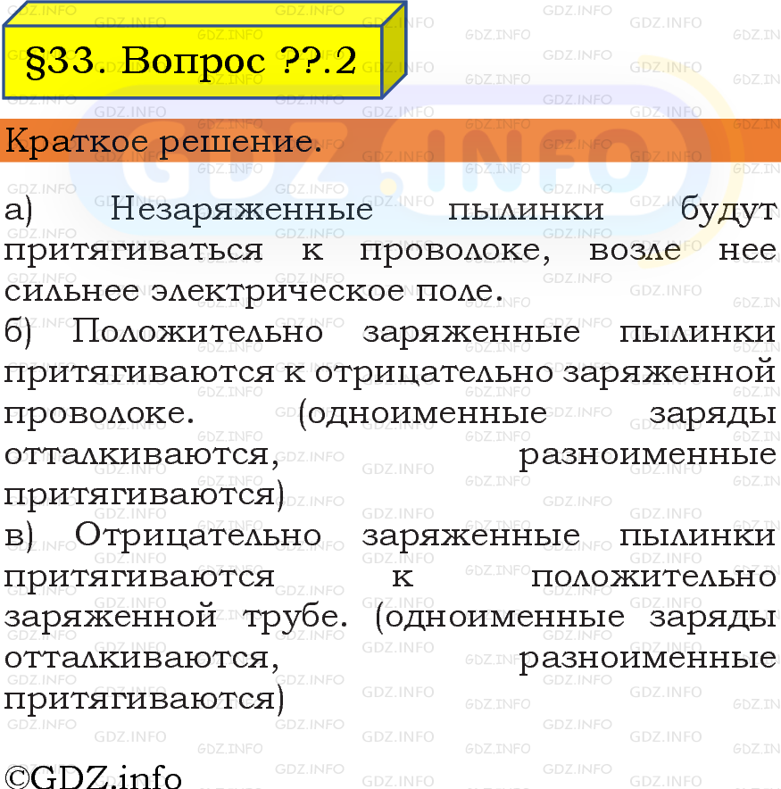 ГДЗ (готовое домашние задание из решебника) по Физике 8 класса авторов И. М. Перышкин, А. И. Иванов, Просвещение, 2023-2025г. ФГОС на Обсуди с товарищами №2, § 33. Применение статического электричества в технике и медицине.