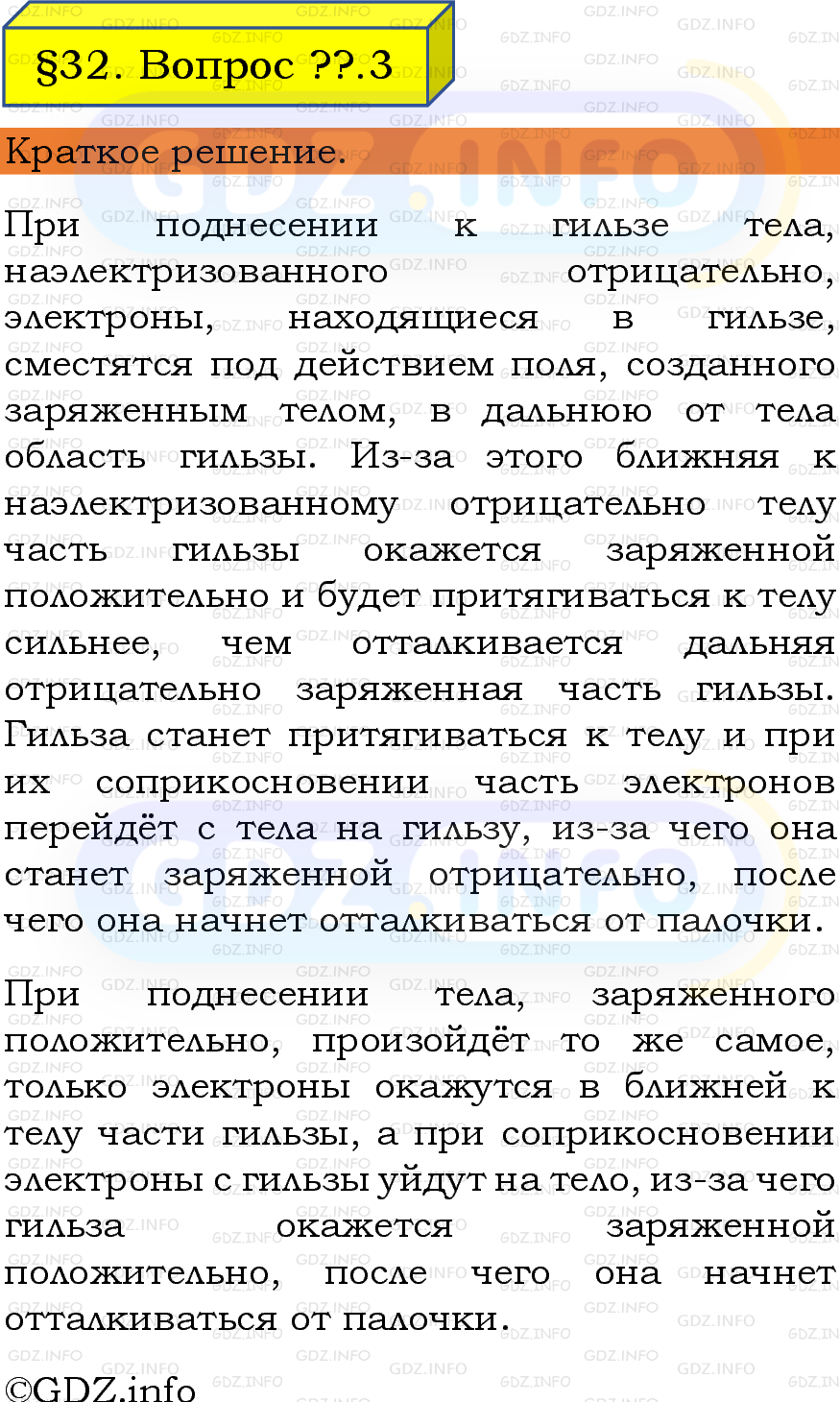 ГДЗ (готовое домашние задание из решебника) по Физике 8 класса авторов И. М. Перышкин, А. И. Иванов, Просвещение, 2023-2025г. ФГОС на Обсуди с товарищами №3, § 32. Закон сохранения электрического заряда.