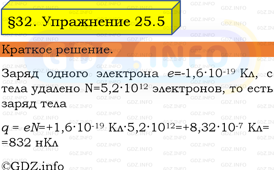 ГДЗ (готовое домашние задание из решебника) по Физике 8 класса авторов И. М. Перышкин, А. И. Иванов, Просвещение, 2023-2025г. ФГОС на Упражнение 25 №5, § 32. Закон сохранения электрического заряда.