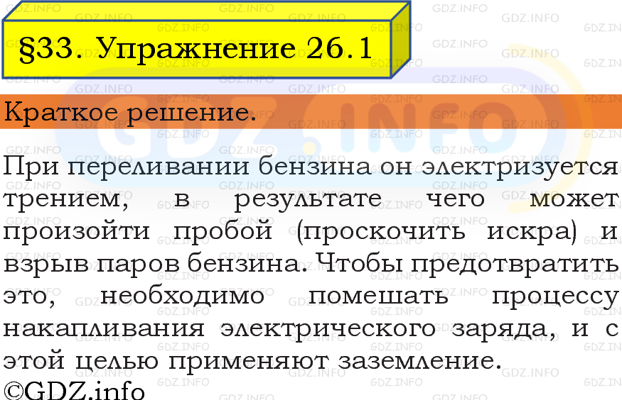 ГДЗ (готовое домашние задание из решебника) по Физике 8 класса авторов И. М. Перышкин, А. И. Иванов, Просвещение, 2023-2025г. ФГОС на Упражнение 26 №1, § 33. Применение статического электричества в технике и медицине.