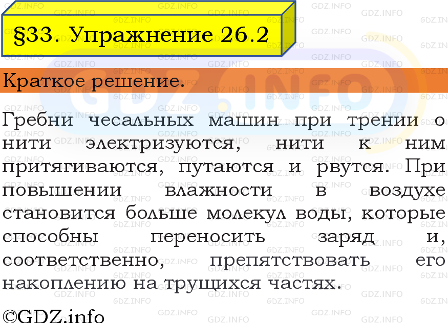 ГДЗ (готовое домашние задание из решебника) по Физике 8 класса авторов И. М. Перышкин, А. И. Иванов, Просвещение, 2023-2025г. ФГОС на Упражнение 26 №2, § 33. Применение статического электричества в технике и медицине.