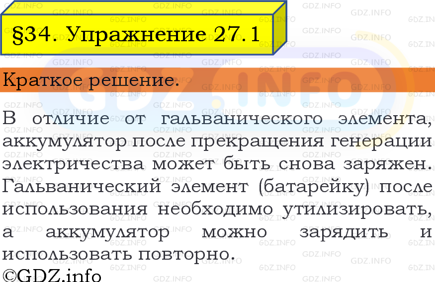 ГДЗ (готовое домашние задание из решебника) по Физике 8 класса авторов И. М. Перышкин, А. И. Иванов, Просвещение, 2023-2025г. ФГОС на Упражнение 27 №1, § 34. Электрический ток. Источники тока.