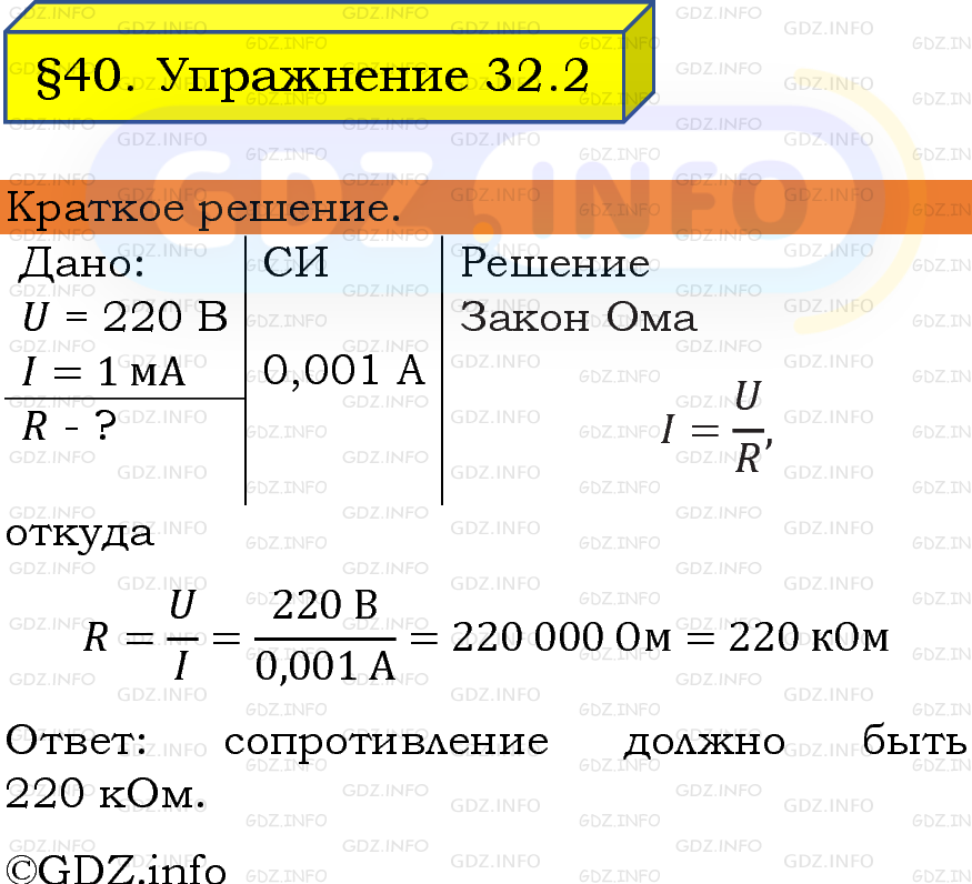 ГДЗ (готовое домашние задание из решебника) по Физике 8 класса авторов И. М. Перышкин, А. И. Иванов, Просвещение, 2023-2025г. ФГОС на Упражнение 32 №2, § 40. Закон Ома для участка цепи.