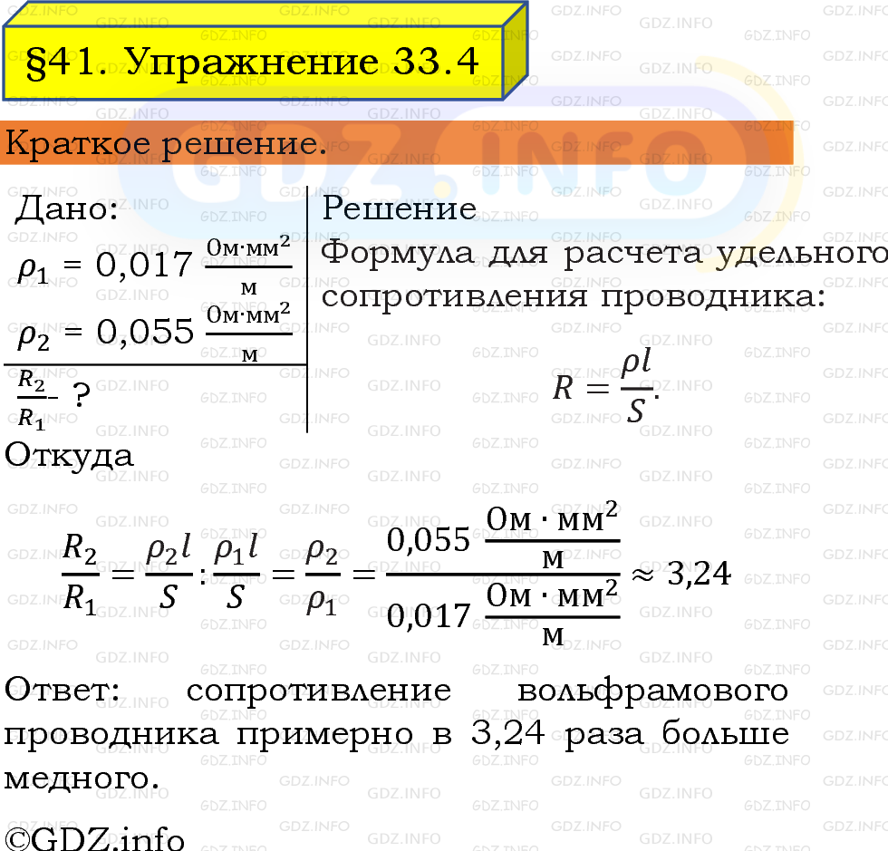 ГДЗ (готовое домашние задание из решебника) по Физике 8 класса авторов И. М. Перышкин, А. И. Иванов, Просвещение, 2023-2025г. ФГОС на Упражнение 33 №4, § 41. Расчёт сопротивления проводника. Удельное сопротивление.