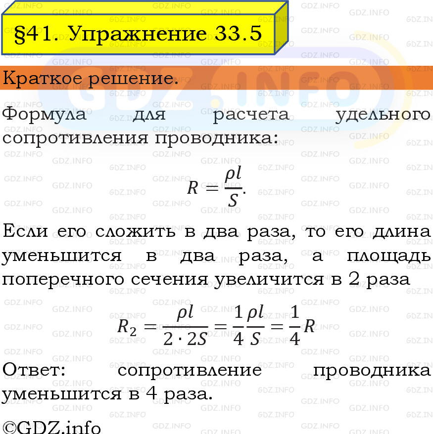 ГДЗ (готовое домашние задание из решебника) по Физике 8 класса авторов И. М. Перышкин, А. И. Иванов, Просвещение, 2023-2025г. ФГОС на Упражнение 33 №5, § 41. Расчёт сопротивления проводника. Удельное сопротивление.