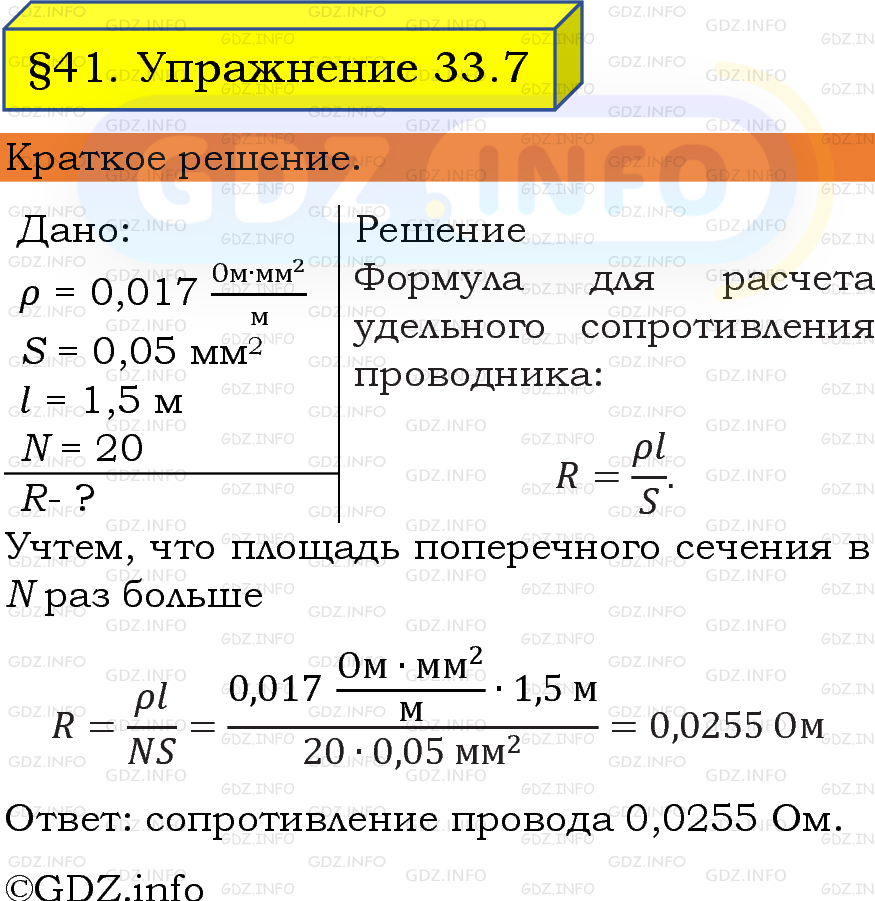 ГДЗ (готовое домашние задание из решебника) по Физике 8 класса авторов И. М. Перышкин, А. И. Иванов, Просвещение, 2023-2025г. ФГОС на Упражнение 33 №7, § 41. Расчёт сопротивления проводника. Удельное сопротивление.