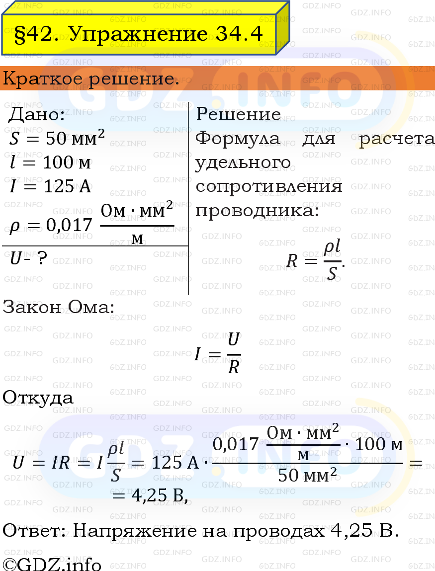 ГДЗ (готовое домашние задание из решебника) по Физике 8 класса авторов И. М. Перышкин, А. И. Иванов, Просвещение, 2023-2025г. ФГОС на Упражнение 34 №4, § 42. Задачи на расчет сопротивления.