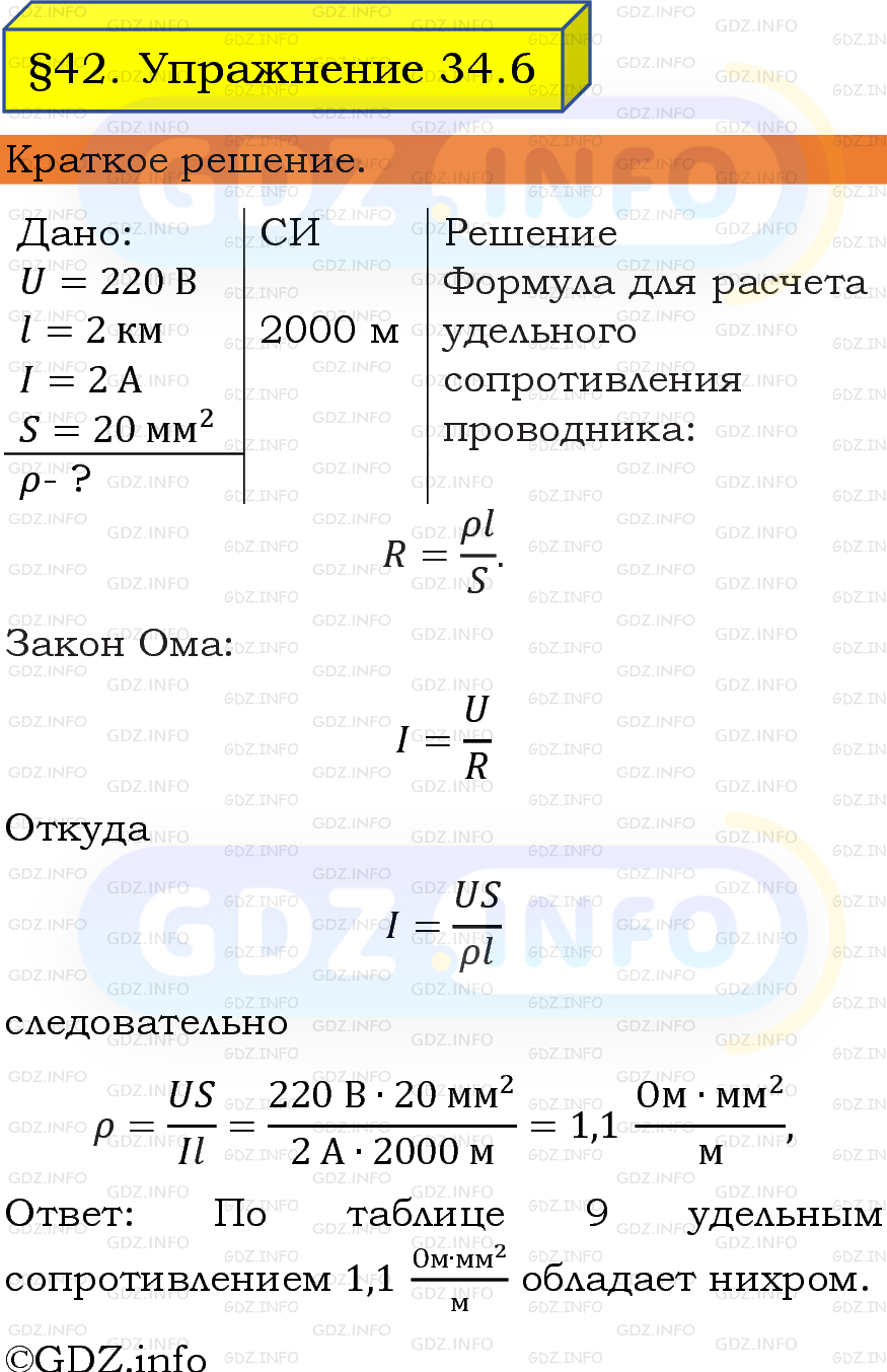 ГДЗ (готовое домашние задание из решебника) по Физике 8 класса авторов И. М. Перышкин, А. И. Иванов, Просвещение, 2023-2025г. ФГОС на Упражнение 34 №6, § 42. Задачи на расчет сопротивления.