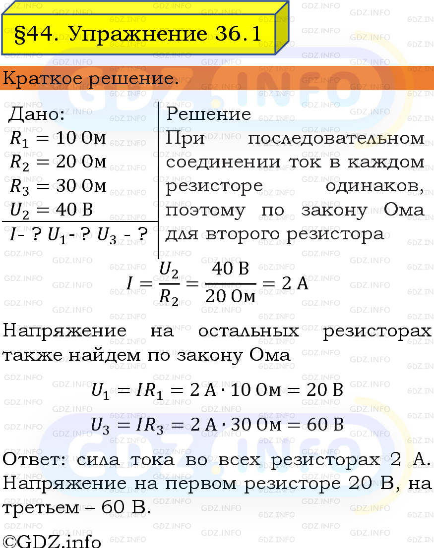 ГДЗ (готовое домашние задание из решебника) по Физике 8 класса авторов И. М. Перышкин, А. И. Иванов, Просвещение, 2023-2025г. ФГОС на Упражнение 36 №1, § 44. Последовательное соединение проводников.