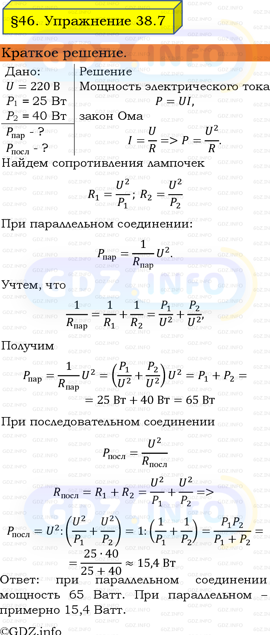 ГДЗ (готовое домашние задание из решебника) по Физике 8 класса авторов И. М. Перышкин, А. И. Иванов, Просвещение, 2023-2025г. ФГОС на Упражнение 38 №7, § 46. Работа и мощность тока.