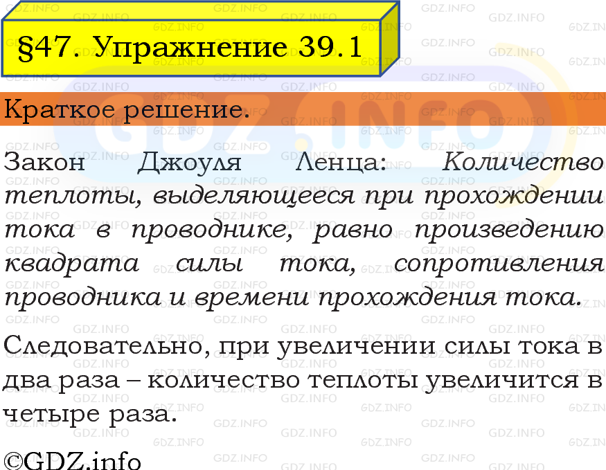 ГДЗ (готовое домашние задание из решебника) по Физике 8 класса авторов И. М. Перышкин, А. И. Иванов, Просвещение, 2023-2025г. ФГОС на Упражнение 39 №1, § 47. Закон Джоуля—Ленца.