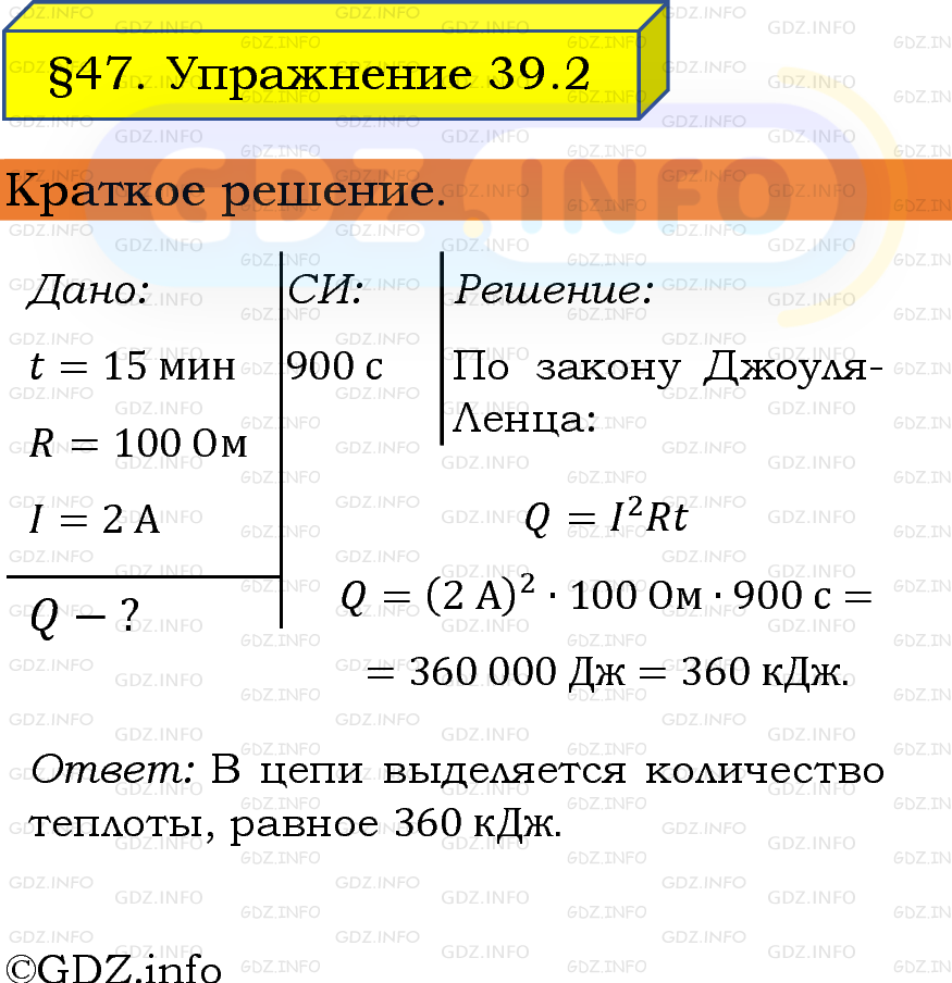 ГДЗ (готовое домашние задание из решебника) по Физике 8 класса авторов И. М. Перышкин, А. И. Иванов, Просвещение, 2023-2025г. ФГОС на Упражнение 39 №2, § 47. Закон Джоуля—Ленца.