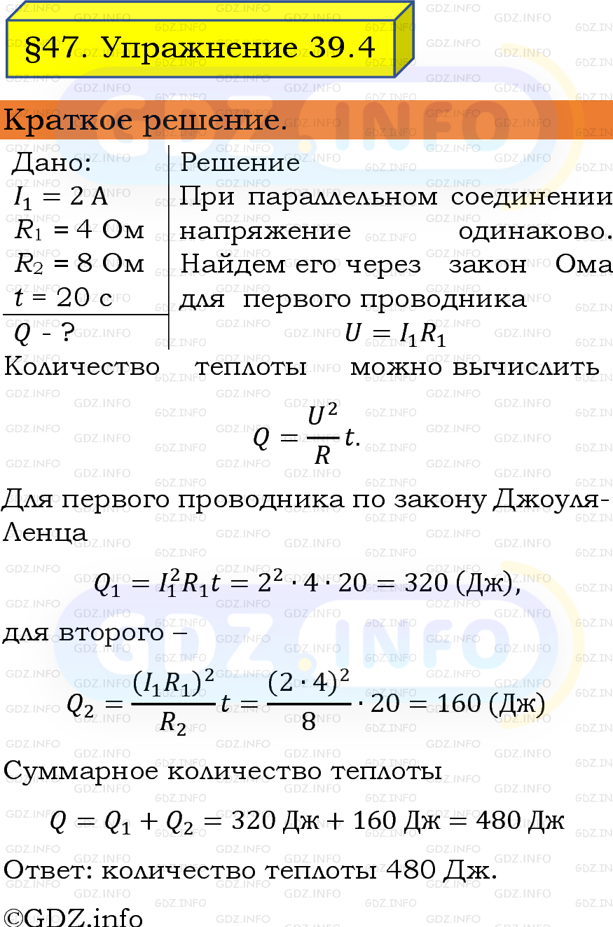 ГДЗ (готовое домашние задание из решебника) по Физике 8 класса авторов И. М. Перышкин, А. И. Иванов, Просвещение, 2023-2025г. ФГОС на Упражнение 39 №4, § 47. Закон Джоуля—Ленца.