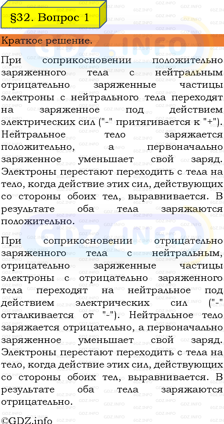 ГДЗ (готовое домашние задание из решебника) по Физике 8 класса авторов И. М. Перышкин, А. И. Иванов, Просвещение, 2023-2025г. ФГОС на Вопрос №1, § 32. Закон сохранения электрического заряда.