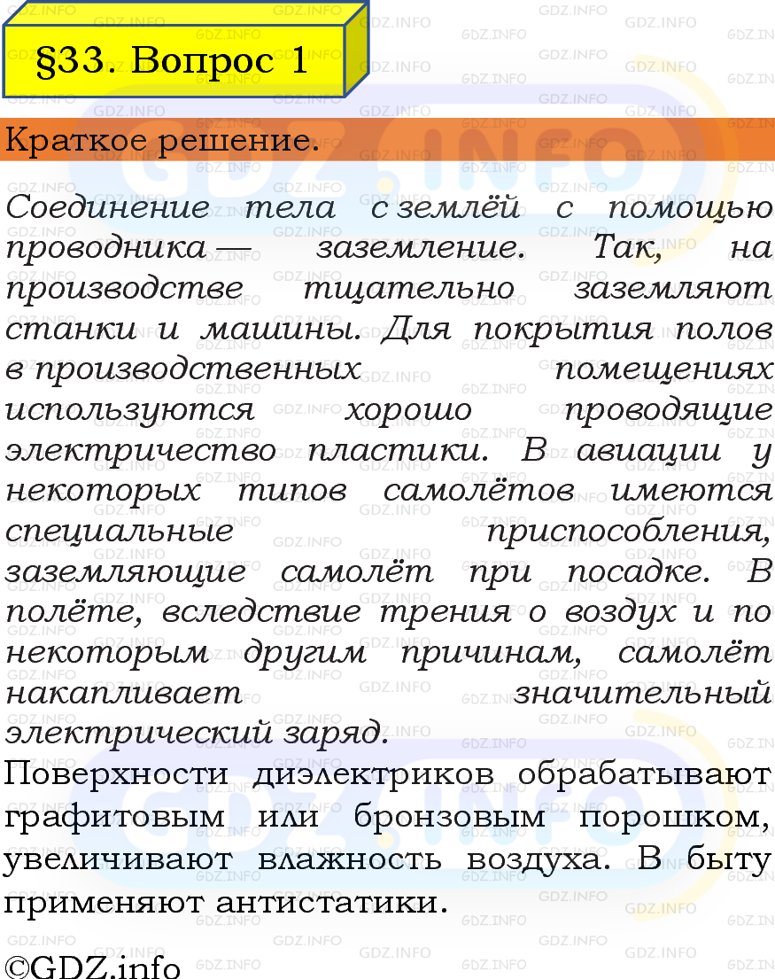 ГДЗ (готовое домашние задание из решебника) по Физике 8 класса авторов И. М. Перышкин, А. И. Иванов, Просвещение, 2023-2025г. ФГОС на Вопрос №1, § 33. Применение статического электричества в технике и медицине.