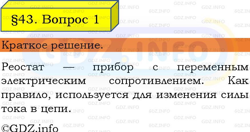 ГДЗ (готовое домашние задание из решебника) по Физике 8 класса авторов И. М. Перышкин, А. И. Иванов, Просвещение, 2023-2025г. ФГОС на Вопрос №1, § 43. Реостаты.