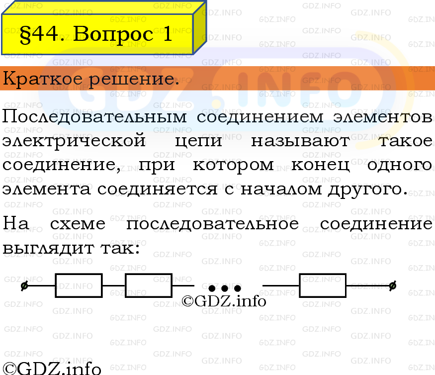ГДЗ (готовое домашние задание из решебника) по Физике 8 класса авторов И. М. Перышкин, А. И. Иванов, Просвещение, 2023-2025г. ФГОС на Вопрос №1, § 44. Последовательное соединение проводников.