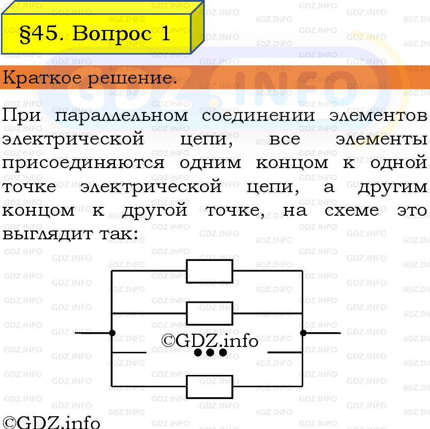 ГДЗ (готовое домашние задание из решебника) по Физике 8 класса авторов И. М. Перышкин, А. И. Иванов, Просвещение, 2023-2025г. ФГОС на Вопрос №1, § 45. Параллельное соединение проводников.