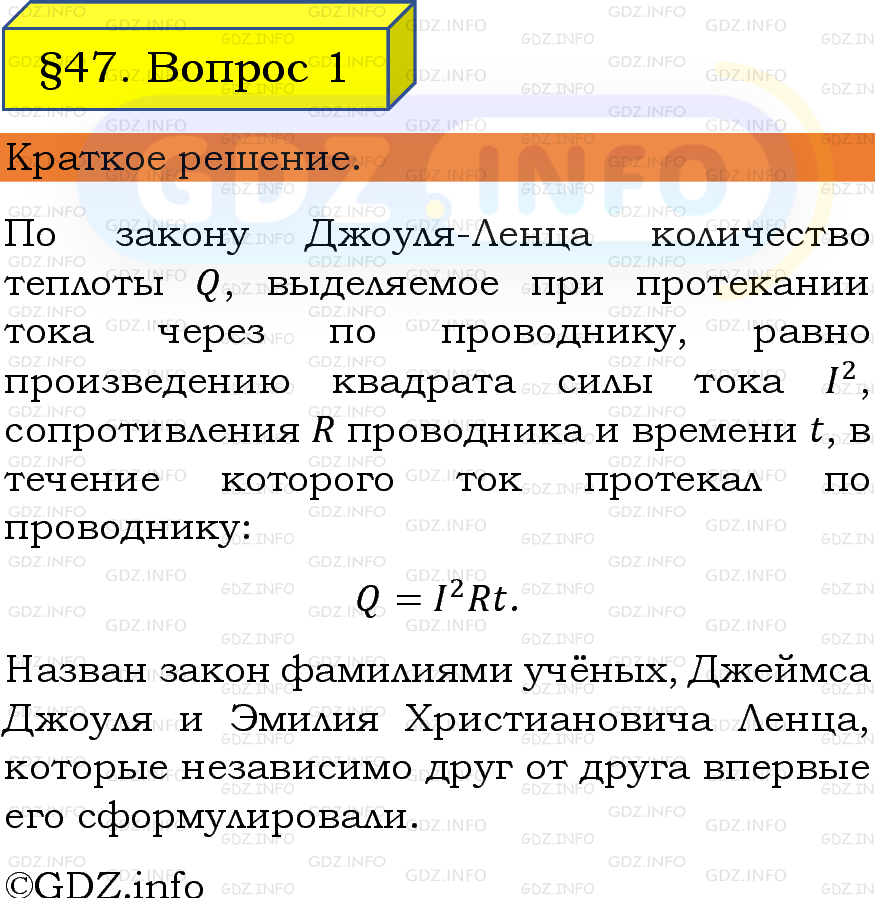 ГДЗ (готовое домашние задание из решебника) по Физике 8 класса авторов И. М. Перышкин, А. И. Иванов, Просвещение, 2023-2025г. ФГОС на Вопрос №1, § 47. Закон Джоуля—Ленца.