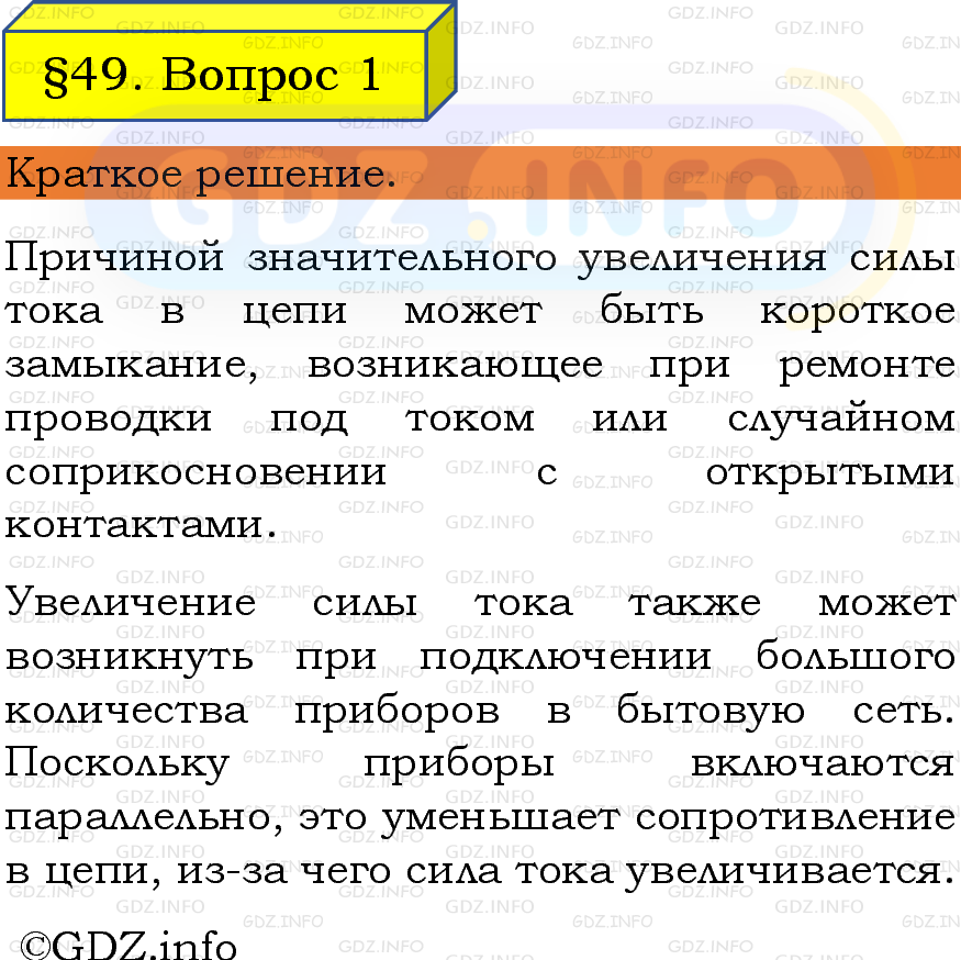 ГДЗ (готовое домашние задание из решебника) по Физике 8 класса авторов И. М. Перышкин, А. И. Иванов, Просвещение, 2023-2025г. ФГОС на Вопрос №1, § 49. Короткое замыкание. Предохранители.
