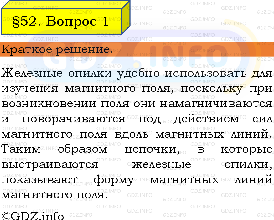 ГДЗ (готовое домашние задание из решебника) по Физике 8 класса авторов И. М. Перышкин, А. И. Иванов, Просвещение, 2023-2025г. ФГОС на Вопрос №1, § 52. Магнитное поле прямого тока. Магнитные линии.