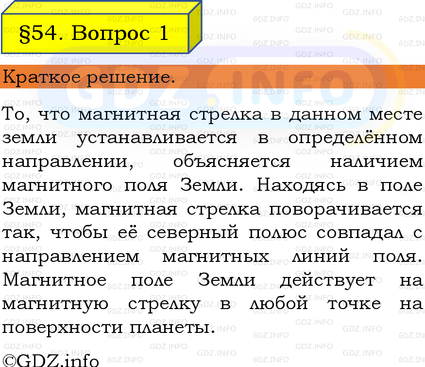 ГДЗ (готовое домашние задание из решебника) по Физике 8 класса авторов И. М. Перышкин, А. И. Иванов, Просвещение, 2023-2025г. ФГОС на Вопрос №1, § 54. Магнитное поле Земли.