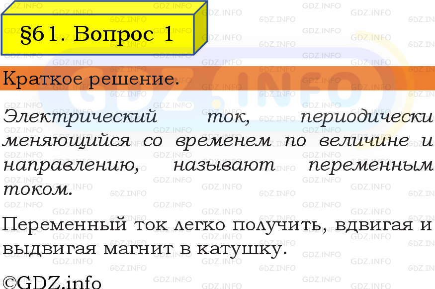ГДЗ (готовое домашние задание из решебника) по Физике 8 класса авторов И. М. Перышкин, А. И. Иванов, Просвещение, 2023-2025г. ФГОС на Вопрос №1, § 61. Переменный электрический ток. Генератор переменного тока.