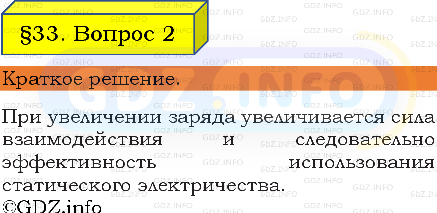 ГДЗ (готовое домашние задание из решебника) по Физике 8 класса авторов И. М. Перышкин, А. И. Иванов, Просвещение, 2023-2025г. ФГОС на Вопрос №2, § 33. Применение статического электричества в технике и медицине.