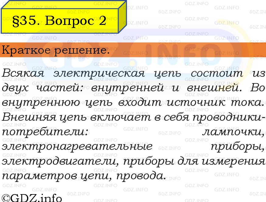 ГДЗ (готовое домашние задание из решебника) по Физике 8 класса авторов И. М. Перышкин, А. И. Иванов, Просвещение, 2023-2025г. ФГОС на Вопрос №2, § 35. Электрическая цепь и её составные части.