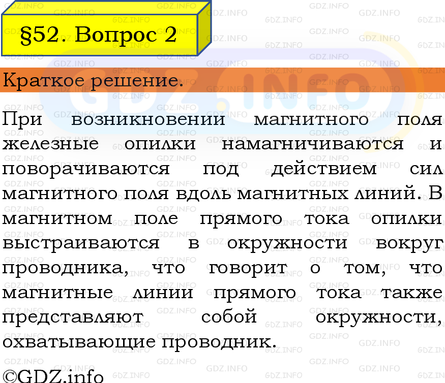 ГДЗ (готовое домашние задание из решебника) по Физике 8 класса авторов И. М. Перышкин, А. И. Иванов, Просвещение, 2023-2025г. ФГОС на Вопрос №2, § 52. Магнитное поле прямого тока. Магнитные линии.