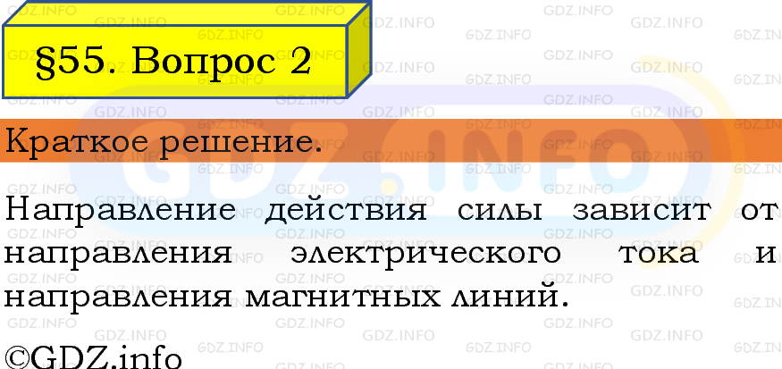 ГДЗ (готовое домашние задание из решебника) по Физике 8 класса авторов И. М. Перышкин, А. И. Иванов, Просвещение, 2023-2025г. ФГОС на Вопрос №2, § 55. Действие магнитного поля на проводник с током.