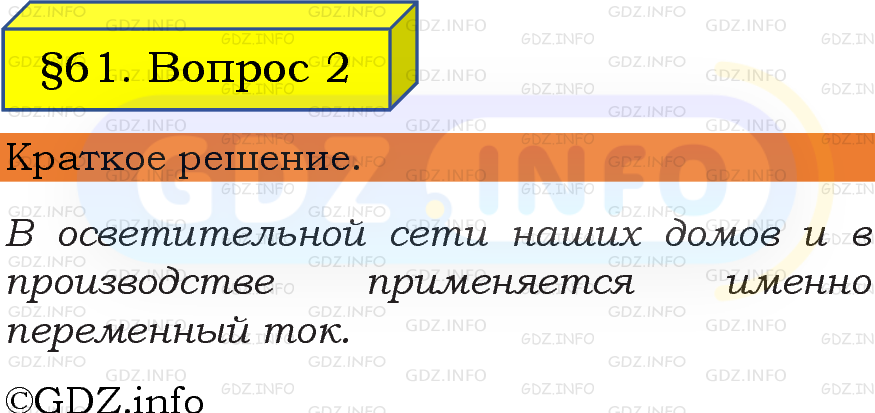 ГДЗ (готовое домашние задание из решебника) по Физике 8 класса авторов И. М. Перышкин, А. И. Иванов, Просвещение, 2023-2025г. ФГОС на Вопрос №2, § 61. Переменный электрический ток. Генератор переменного тока.