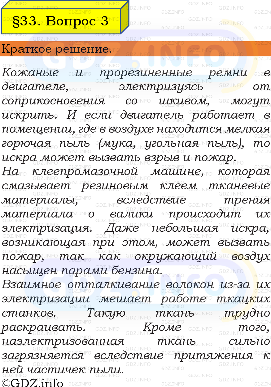 ГДЗ (готовое домашние задание из решебника) по Физике 8 класса авторов И. М. Перышкин, А. И. Иванов, Просвещение, 2023-2025г. ФГОС на Вопрос №3, § 33. Применение статического электричества в технике и медицине.
