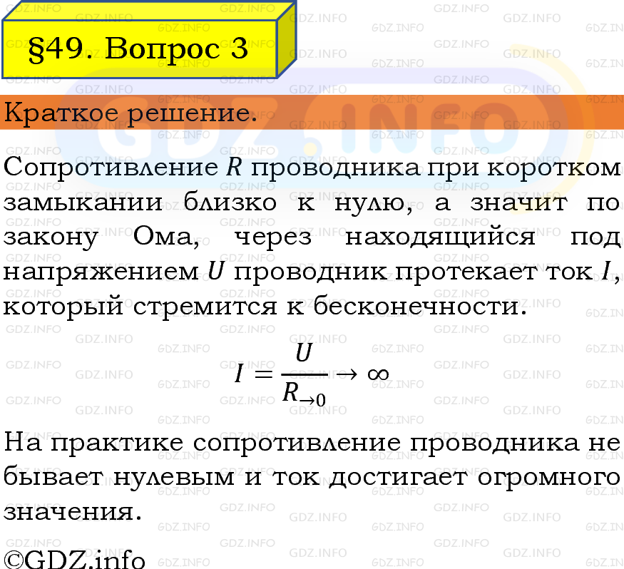 ГДЗ (готовое домашние задание из решебника) по Физике 8 класса авторов И. М. Перышкин, А. И. Иванов, Просвещение, 2023-2025г. ФГОС на Вопрос №3, § 49. Короткое замыкание. Предохранители.