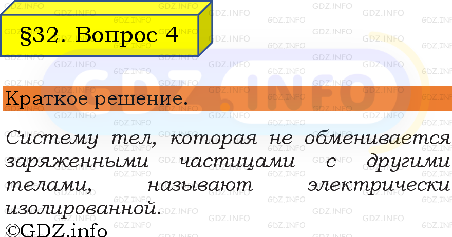 ГДЗ (готовое домашние задание из решебника) по Физике 8 класса авторов И. М. Перышкин, А. И. Иванов, Просвещение, 2023-2025г. ФГОС на Вопрос №4, § 32. Закон сохранения электрического заряда.