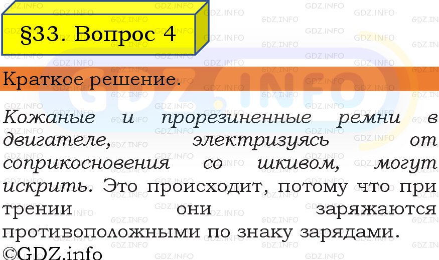ГДЗ (готовое домашние задание из решебника) по Физике 8 класса авторов И. М. Перышкин, А. И. Иванов, Просвещение, 2023-2025г. ФГОС на Вопрос №4, § 33. Применение статического электричества в технике и медицине.