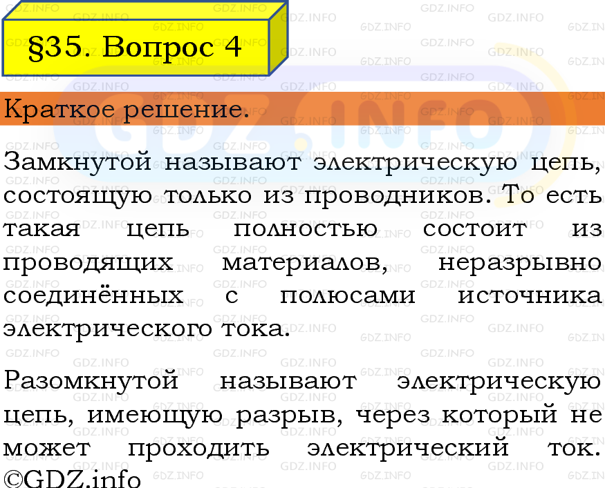 ГДЗ (готовое домашние задание из решебника) по Физике 8 класса авторов И. М. Перышкин, А. И. Иванов, Просвещение, 2023-2025г. ФГОС на Вопрос №4, § 35. Электрическая цепь и её составные части.
