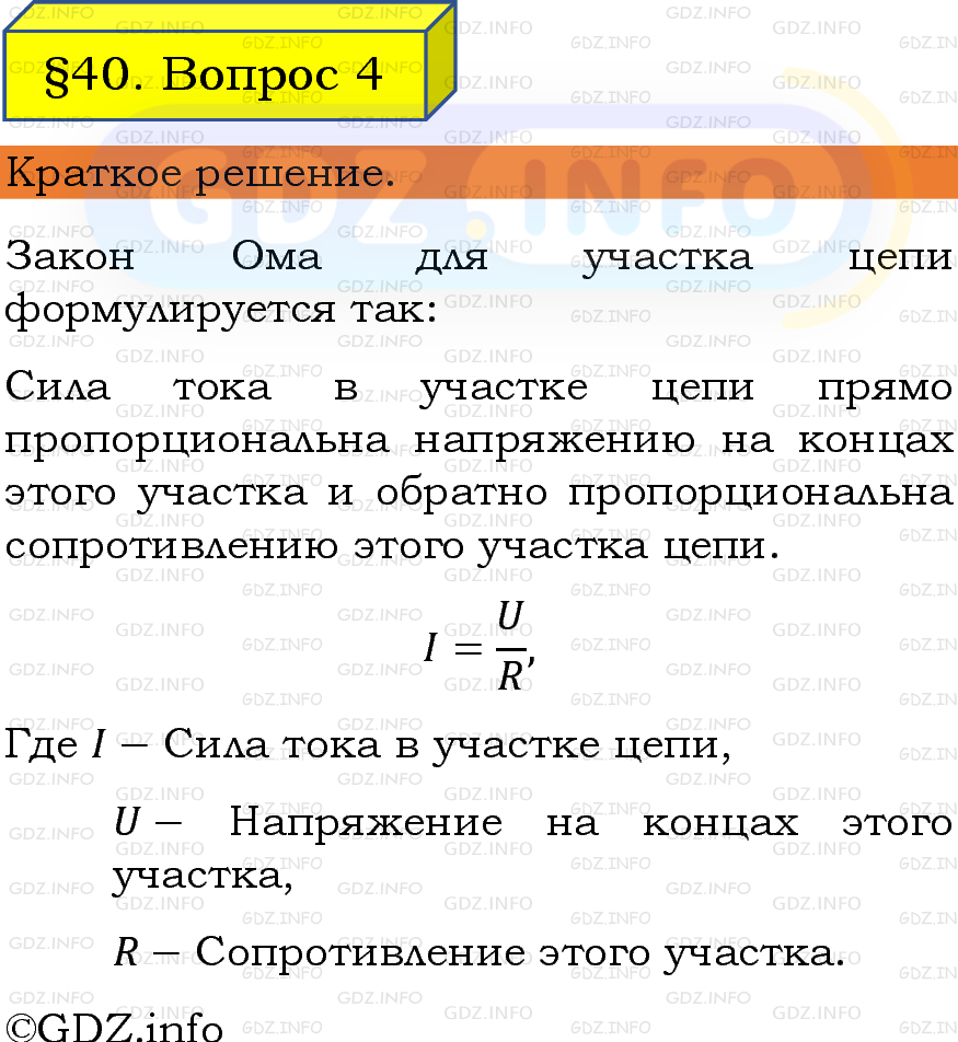 ГДЗ (готовое домашние задание из решебника) по Физике 8 класса авторов И. М. Перышкин, А. И. Иванов, Просвещение, 2023-2025г. ФГОС на Вопрос №4, § 40. Закон Ома для участка цепи.