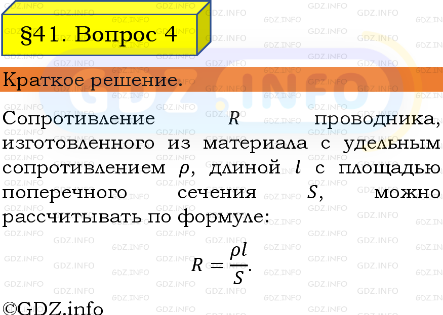 ГДЗ (готовое домашние задание из решебника) по Физике 8 класса авторов И. М. Перышкин, А. И. Иванов, Просвещение, 2023-2025г. ФГОС на Вопрос №4, § 41. Расчёт сопротивления проводника. Удельное сопротивление.