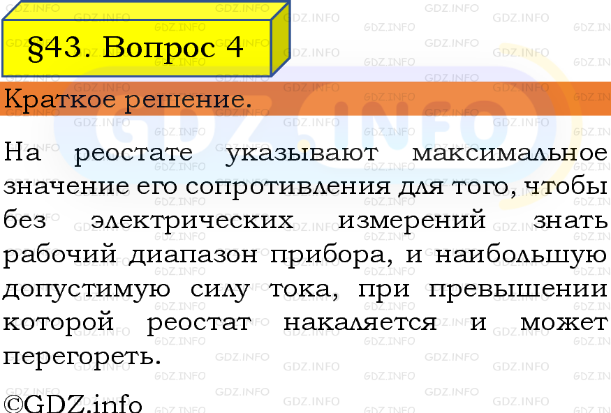 ГДЗ (готовое домашние задание из решебника) по Физике 8 класса авторов И. М. Перышкин, А. И. Иванов, Просвещение, 2023-2025г. ФГОС на Вопрос №4, § 43. Реостаты.