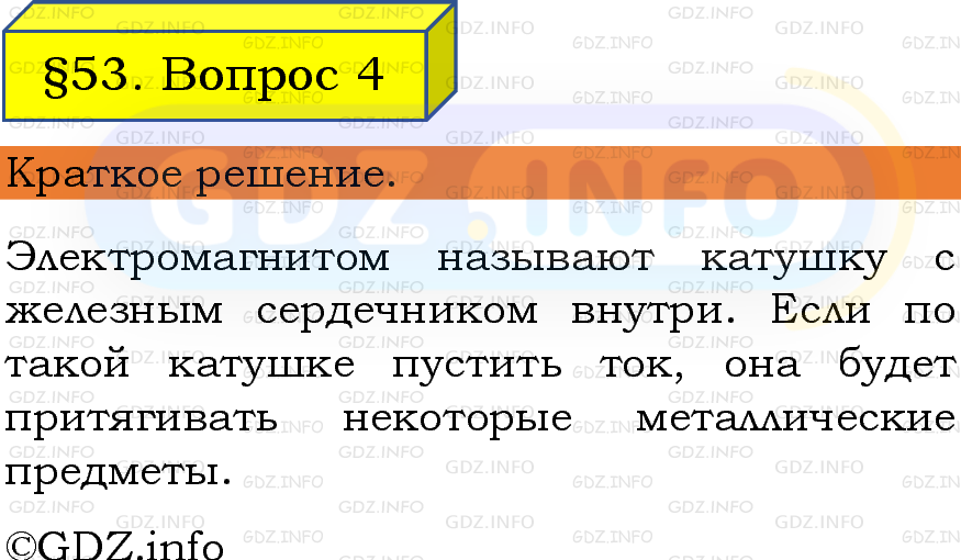 ГДЗ (готовое домашние задание из решебника) по Физике 8 класса авторов И. М. Перышкин, А. И. Иванов, Просвещение, 2023-2025г. ФГОС на Вопрос №4, § 53. Магнитное поле катушки с током. Электромагниты.