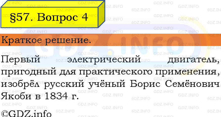 ГДЗ (готовое домашние задание из решебника) по Физике 8 класса авторов И. М. Перышкин, А. И. Иванов, Просвещение, 2023-2025г. ФГОС на Вопрос №4, § 57. Электрический двигатель.