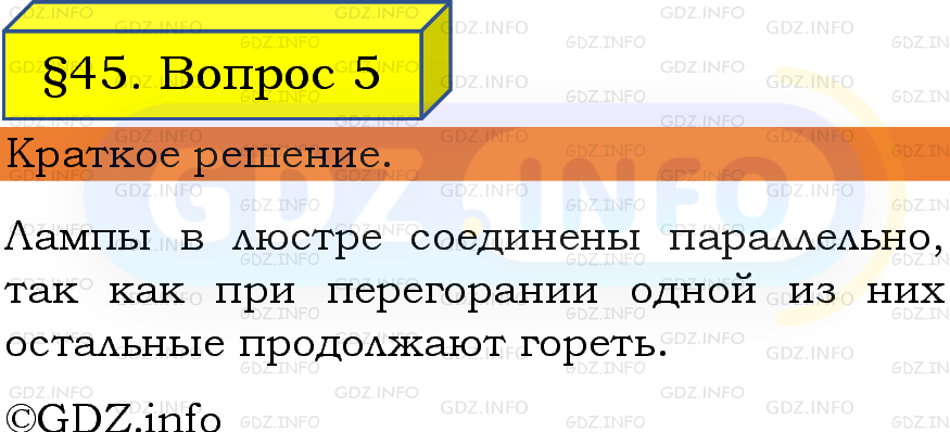 ГДЗ (готовое домашние задание из решебника) по Физике 8 класса авторов И. М. Перышкин, А. И. Иванов, Просвещение, 2023-2025г. ФГОС на Вопрос №5, § 45. Параллельное соединение проводников.