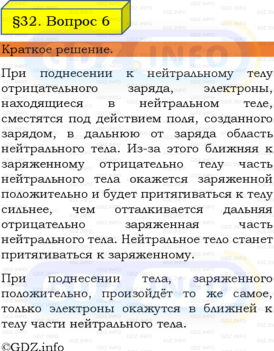 ГДЗ (готовое домашние задание из решебника) по Физике 8 класса авторов И. М. Перышкин, А. И. Иванов, Просвещение, 2023-2025г. ФГОС на Вопрос №6, § 32. Закон сохранения электрического заряда.