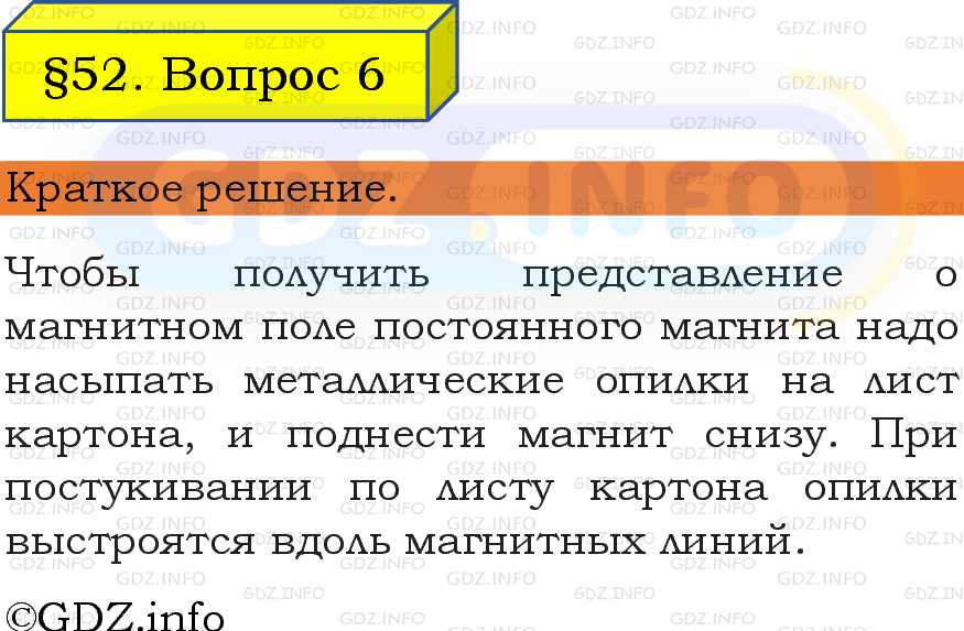 ГДЗ (готовое домашние задание из решебника) по Физике 8 класса авторов И. М. Перышкин, А. И. Иванов, Просвещение, 2023-2025г. ФГОС на Вопрос №6, § 52. Магнитное поле прямого тока. Магнитные линии.